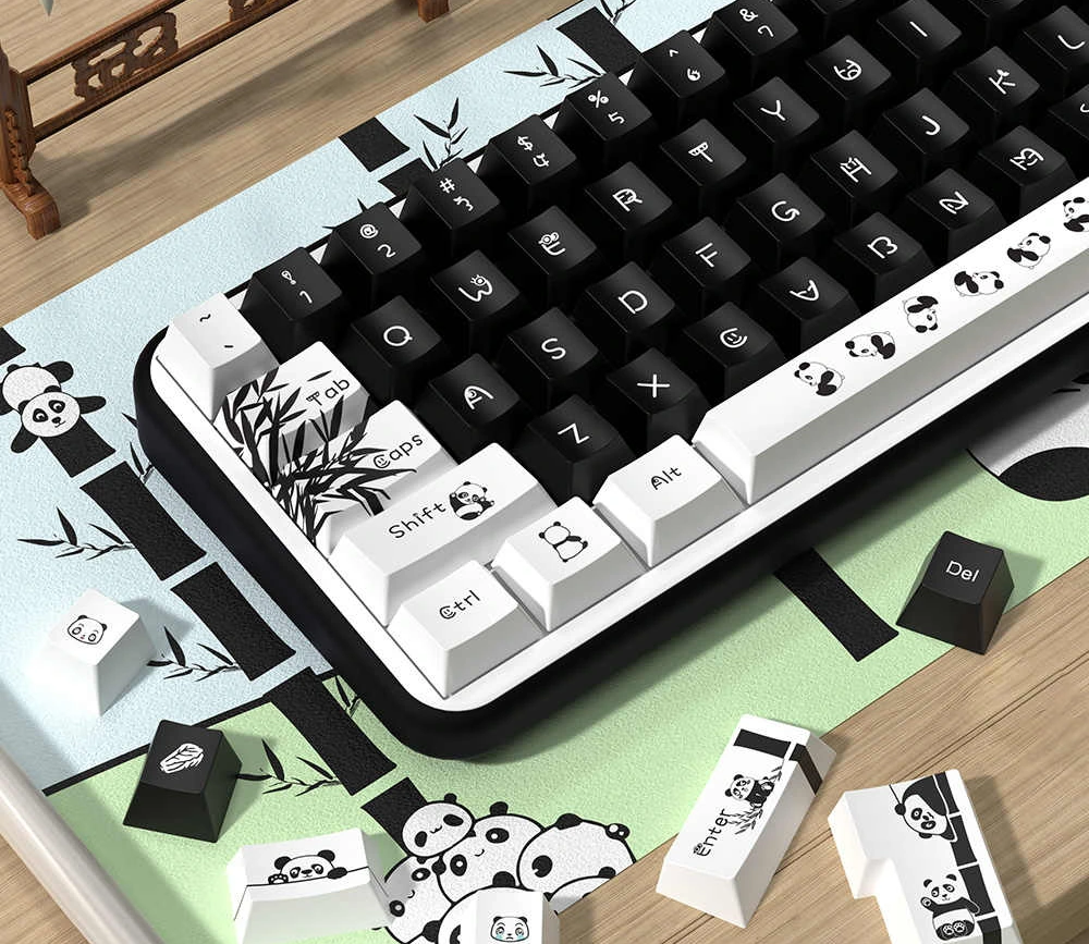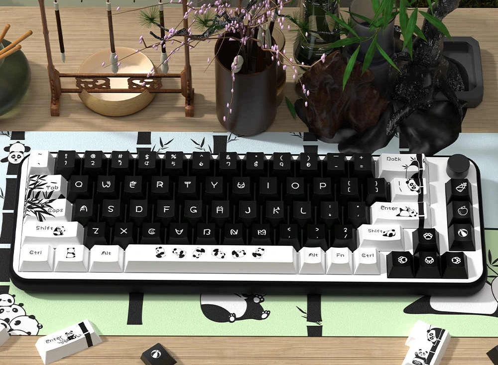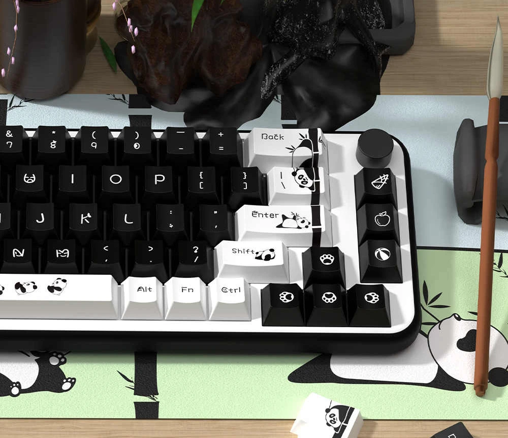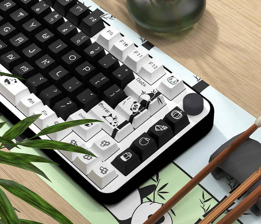 Ciepły, przytulny zestaw inspirowany pandami i spokojną, azjatycką estetyką. Miękka, cute czcionka w połączeniu z charakterystycznymi motywami pand, takimi jak bambusowe akcenty i delikatne ilustracje, nadaje klawiaturze bardzo łagodny, kojący charakter. Panda PBT idealnie pasuje do cozy setupów, jasnych biurek i klawiatur, które mają budować cozy atmosferę z codziennego użytkowania.